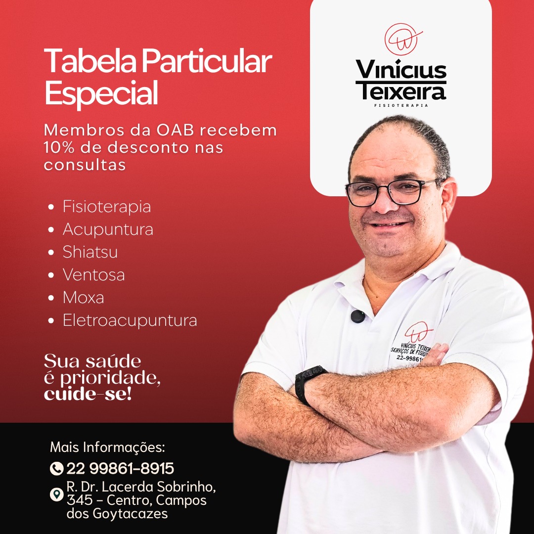 PARCERIA OAB-12a Subseção. A Fisioterapeuta, Enfermeira e Acupunturista Dermato Funcional Dra. Fernanda Siqueira, localizada RUA BARÃO DA LAGOA DOURADA 324, CENTRO CAMPO DOS GOYTACAZES/ RJem Campos dos Goytacazes, firmou uma parceira com a OAB-12a Subseção e agora Advogados, Advogadas, Estagiários e funcionários da OAB-RJ, tem DESCONTO de 15% (quinze por cento) por sessão em diversos tratamentos."