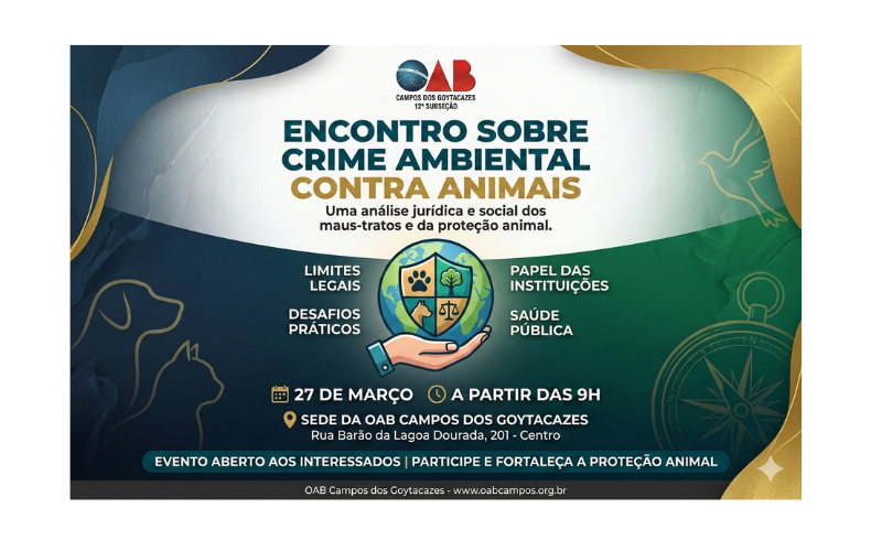 A proteção animal deixou de ser apenas uma causa humanitária para se tornar uma pauta jurídica rigorosa e urgente. No próximo dia 27 de março, a OAB Campos dos Goytacazes (12ª Subseção) realiza um encontro estratégico para discutir os crimes ambientais voltados aos animais, reunindo especialistas para analisar os limites da lei e os desafios da saúde pública.