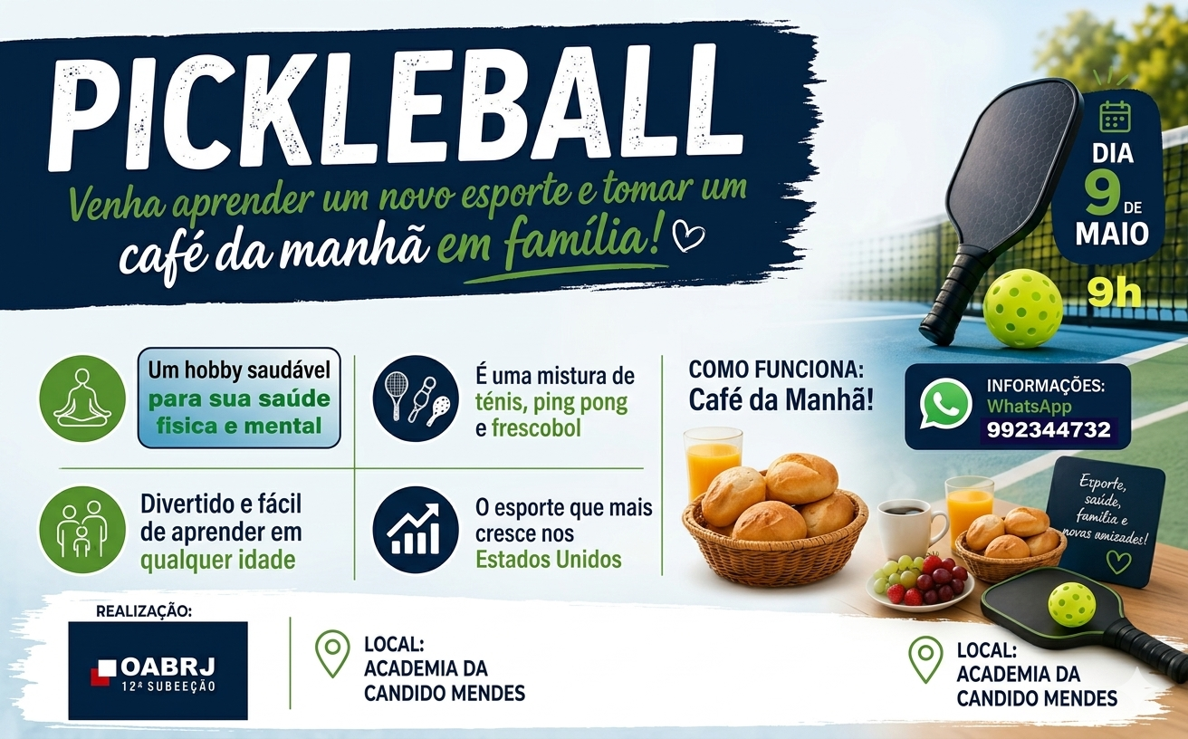 O destaque do evento será a oportunidade de conhecer o Pickleball, modalidade que vem ganhando entusiastas em todo o mundo por ser fácil de aprender e extremamente social. O objetivo é proporcionar um momento de descontração fora do ambiente jurídico, incentivando a prática de atividades físicas e o fortalecimento dos laços entre a classe.